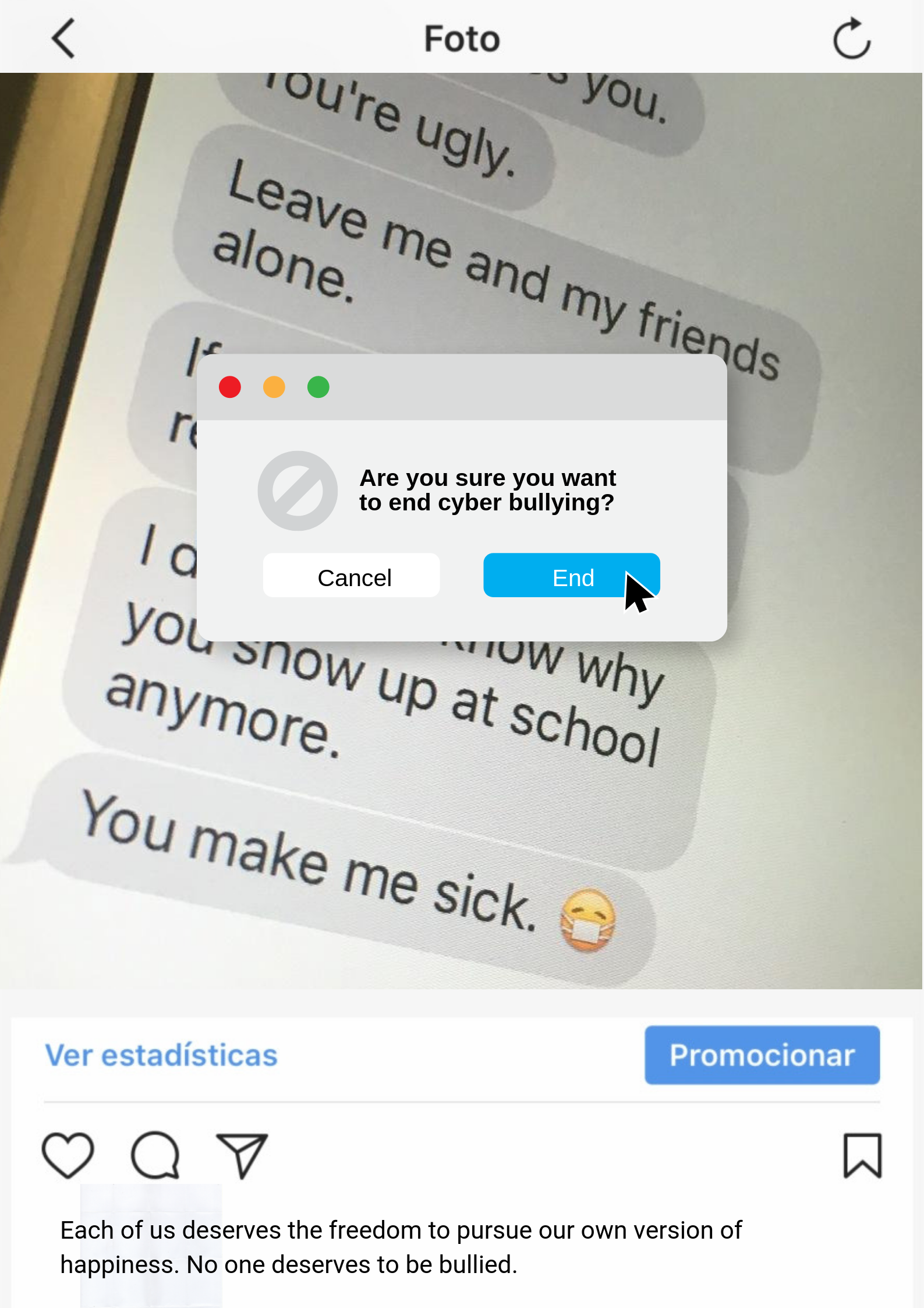 CYBERBULLYING is not just a simple issue in our world today. This problem will not only cause minimal effects but it could change the lives of many children or teenagers. Cyberbullying is done when someone uses technology (digital phones, computer, tablets, messenger) to draw fear and humiliation to another person. This could affect one’s personality, confidence, and even dignity. Each of us has the freedom to live the life that we want and no one has the right to judge it. Perfection doesn’t exist because of the fact that every person experiences failures and victories in their lives. Right now let us make a change, and let everyone know that IN EVERY WEAKNESS, THERE IS GREATNESS. Don’t let others pull you down and don’t pull others down. Bullying others would not make you look tough and impressive, but it will just make you look rude and trying to find attention from others. Let each person know that they are worth it and they have the purpose in this world. CYBERBULLYING, LET’S END THIS NOW!